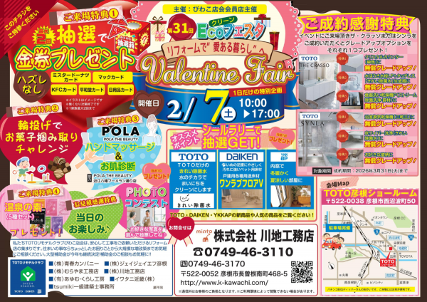 2026/01/26 イベントを開催します イベントのお知らせです 開催日 2月7日(土) 10:00~17:00 TOTO彦根ショールームにてECOフェスタを開催いたします。ご来場特典やご成約感謝特典など色々な企画をご用意しております。1日だけの特別企画にぜひご来場ください。